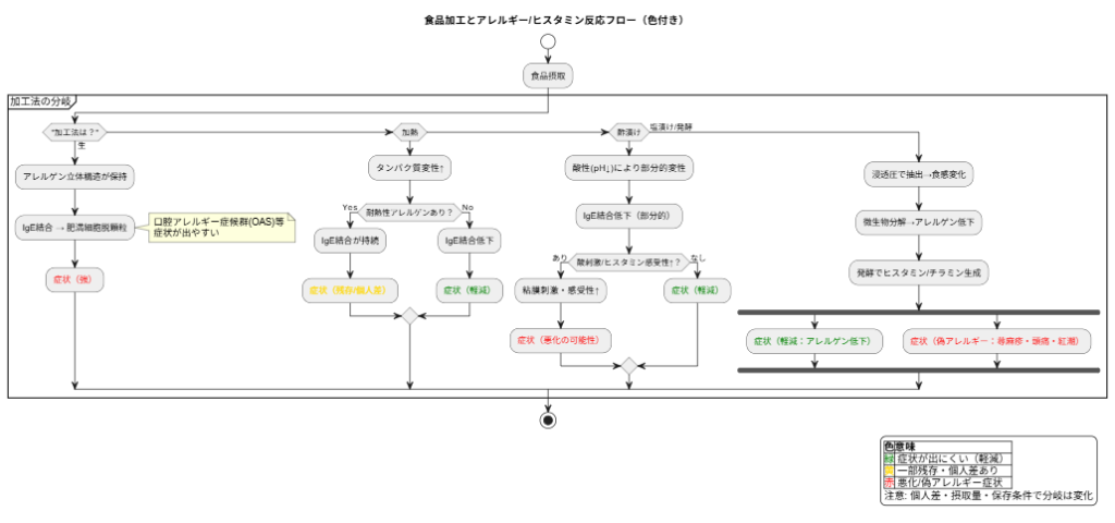 このフロー図では、食品が「生」「加熱」「酢漬け」「塩漬け(発酵)」に加工されたとき、それぞれの経路で IgEアレルギー あるいは ヒスタミンによる偽アレルギー にどうつながるかを表しています。